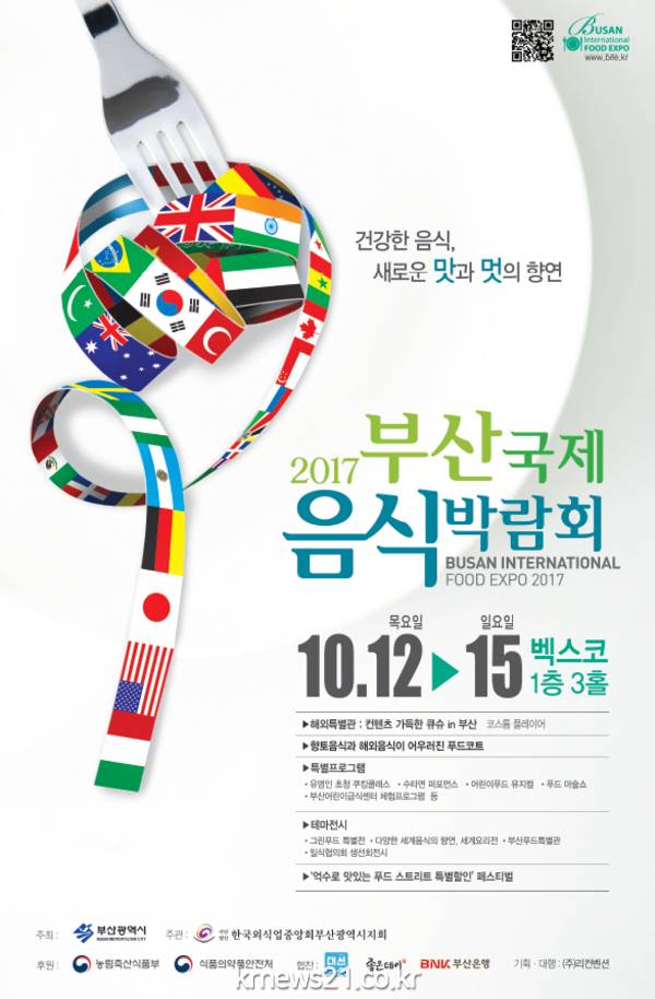 부산시는 10월 12일부터 10월 15일까지 벡스코 제1전시장에서 ‘건강한 음식,새로운 맛과 멋의 향연’ 이라는 주제로 ‘2017년 제14회 부산국제음식박람회’를개최한다.