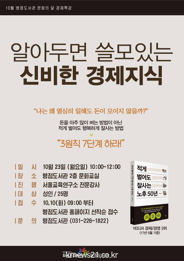 화성시 시립도서관(관장 강신하) 병점 도서관에서는 성인대상의 경제특강 <</span>적게 벌어도 잘사는 노후 50년> 강의를 진행한다.