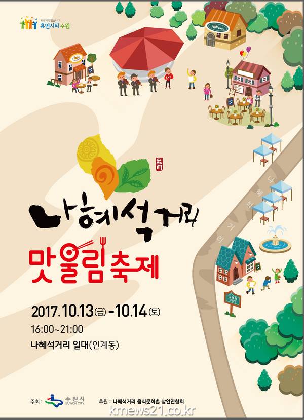 ‘나혜석거리 음식문화촌’ 음식점 22개소와 노점상인회가 참여하는 올해 축제는 수원양념갈비, 즉석 고추장 만들기 등 전통음식 체험 한마당, ‘2017 올해의 수원빵’ 시식, 음식문화촌 먹거리 시식, 버스킹 공연 등 다채로운 행사로 시민들을 맞는다.