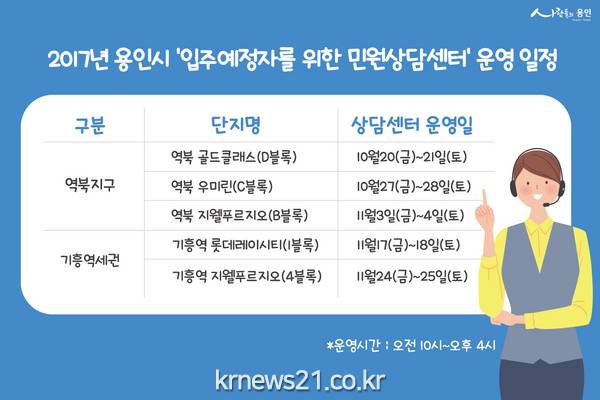 용인시는 앞으로 입주가 임박한 공동주택 현장에 입주민의 궁금증을 풀어주고 공동주택 시공관련 업무처리를 돕는 민원상담센터를 운영하기로 했다고 11일 밝혔다.