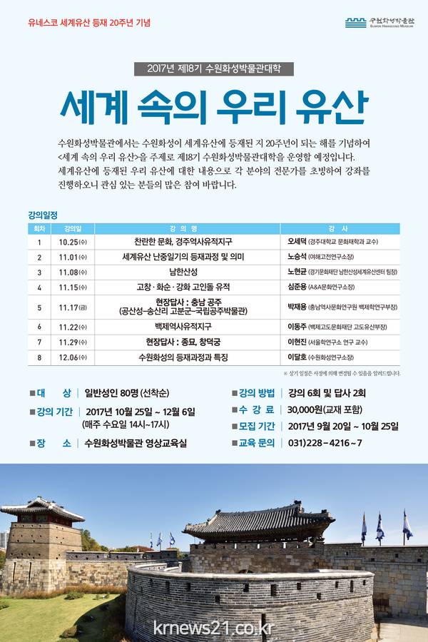 이번 강좌는 수원화성 세계문화유산 등재 20주년을 기념해 ‘세계 속의 우리 유산’을 주제로 진행된다. 이달 25일부터 12월 6일까지 매주 수요일(오후 2~5시) 8회 과정이다.
