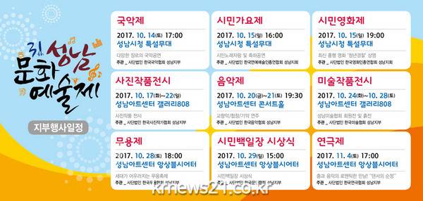 개최 날짜와 장소는 국악제=10월 14일 오후 5시. 성남시청 특설무대, 시민가요제=10월 15일 오후 4시. 성남시청 특설무대, 시민영화제 ‘청년경찰’ 상영=10월 15일 오후 7시. 성남시청 특설무대, 사진작품 전시=10월 17~22일. 성남아트센터 갤러리, 음악제=10월 20~21일 오후 7시 30분. 성남아트센터 콘서트홀, 미술작품 전시=10월 24~28일. 성남아트센터 갤러리, 무용제=10월 28일 오후 6시. 성남아트센터 앙상블 시어터, 시민백일장 시상식=10월 29일 오후 3시. 성남아트센터 앙상블 시어터. 연극제 ‘댄서의 순정’ 공연=11월 4일 오후 5시. 성남아트센터 앙상블 시어터 등이다.