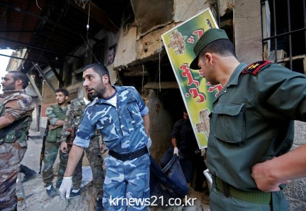 ▲ AFP / LOUAI BESHARA[제공자ⓒ 뉴스21통신. 무단전재-재배포 금지.]시리아 보안군이 다마스커스 경찰 본부 근처에서 자살 폭탄 테러를 일으킨 용의자 시신을 수습하고 있다.