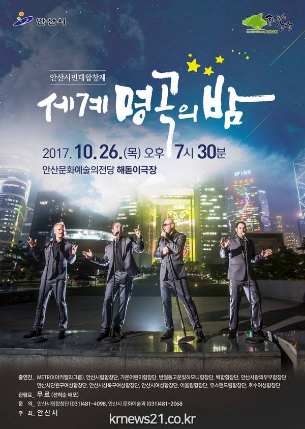 안산시(시장 제종길)가 오는 10월 26일 안산문화예술의전당 해돋이극장에서 '안산시민대합창제 세계명곡의 밤' 합창제를 개최한다.