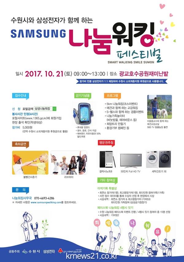가족이 함께 운동하며 소외된 이웃도 도울 수 있는 ‘수원시와 삼성전자가 함께하는 삼성 나눔 워킹 페스티벌’이 21일 오전 9시부터 오후 1시까지 광교호수공원 ‘재미난 밭’에서 열린다.