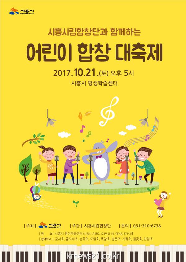 시흥시(시장 김윤식)는 오는 10월 21일 (토) 오후 5시, 시흥시립합창단과 함께하는 <</span>어린이 합창대축제>를 평생학습센터 공연장에서 개최한다.