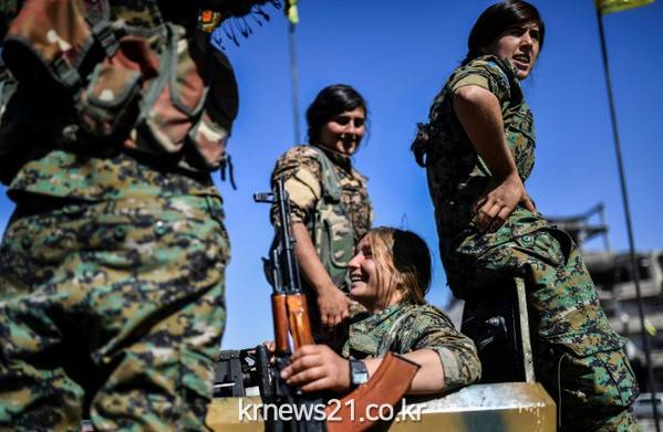 미군의 지원을 받는 시리아 민주군(SDF) 군인들이 이슬람 무장조직 이슬람국가(IS) 수도 격이 락까를 탈환한 후 알-나임 광장(Al-Naim square)에서 축하 행사를 위해 모였다.