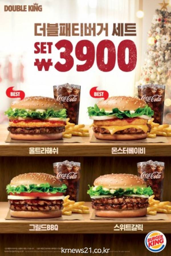 버거킹의 더블킹은 패티가 두 장 들어간 버거 메뉴로 꾸준한 사랑을 받고 있는 ‘몬스터베이비’, ‘그릴드BBQ’, ‘스위트갈릭’과 ‘울트라해쉬’까지 총 네 종류의 다양한 맛으로 즐길 수 있다.
