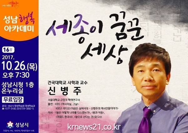 성남시(시장 이재명)는 오는 10월 26일 신병주 건국대학교 사학과 교수를 초빙해 성남행복 아카데미 야간 강연을 연다.