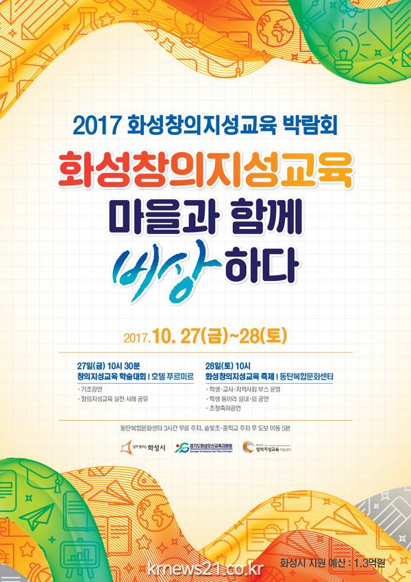 ‘2017 화성창의지성교육 박람회’는 화성시와 경기도 화성오산 교육지원청, 화성시 창의지성교육지원센터 공동주관으로 개최되며, 박람회에 대한 자세한 내용은 화성시청(www.hscity.go.kr) 또는 창의지성교육지원센터(www.hsccie.com)에서 확인할 수 있다.