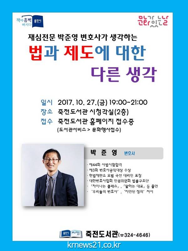 용인시는 유명 저자를 초청해 강연을 듣는‘북 타임’의 10월 강좌로 오는 27일 죽전도서관에서 ‘우리들의 변호사’의 저자인 박준영 씨의 강연을 개최한다고 밝혔다.