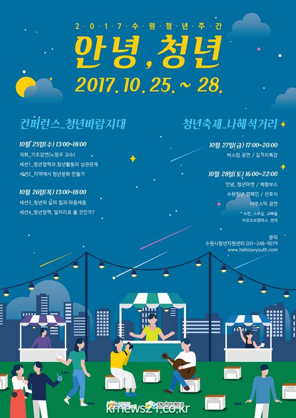 수원시는 25~28일을 ‘수원 청년주간’으로 정하고, 같은 기간 청년바람지대·나혜석거리에서 바람직한 청년정책과 청년활동 방향, 청년문화 활성화 방안을 모색하는 ‘2017 수원청년주간 안녕, 청년’을 개최한다.