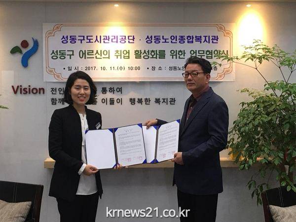 성동구도시관리공단(이사장 김종수)은 ‘지역사회 고령자 취업 활성화를 위한 상호협력 양해각서(MOU)’를 11일 성동노인종합복지관과 체결했다.