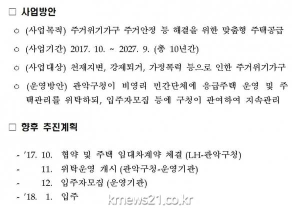 LH는 지역현안 맞춤형 임대주택 공급의 일환으로 매입임대주택 총 5호를 향후 10년 간 관악구에 무상 제공하기로 결정했으며, 관악구는 입주자 관리 업무는 비영리 민간단체인 관악주거복지센터에, 주택 인테리어 보수 등 유지보수 업무는 사회적기업인 일터인테리어에 각각 위탁하여 임시거주용 응급주택 등으로 활용할 계획이다.