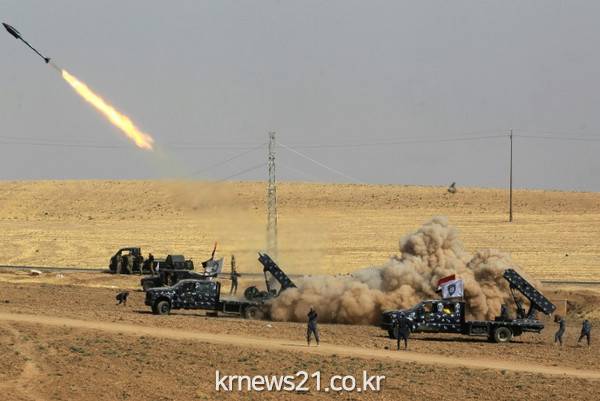 이라크 쿠르드자치정부(KRG)는 25일(현지시간) 새벽 낸 긴급 성명에서 지난달 25일 분리·독립을 위한 찬반투표의 결과를 동결한다고 밝혔다. 사진은 이라크 정부군이 교전중이 쿠르드 자치지역 인근에서 로켓을 쏘며 위협하고 있다.
