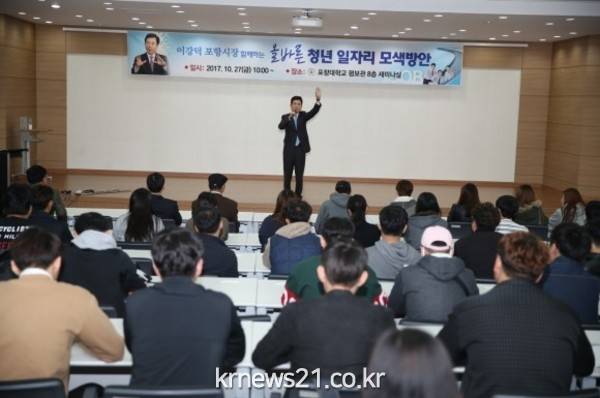 이강덕 포항시장은 지난 28일 포항대 평보관에서 열린 특강자리에서 청년 일자리 정보를 한 곳에서 이용할 수 있도록 ‘포항 청춘센터’를 운영해 새로운 문화와 일자리 발굴의 장을 마련하겠다고 말했다.