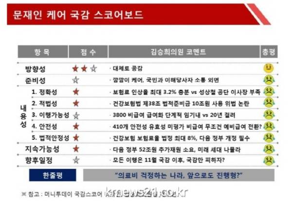 국회 보건복지위원회 김승희 의원(자유한국당)은 31일 2017년도 국정감사를 마무리하며, 건강보험 보장성 강화 대책에 대한 ‘문재인 케어 국감 스코어보드’ 자료를 공개했다.