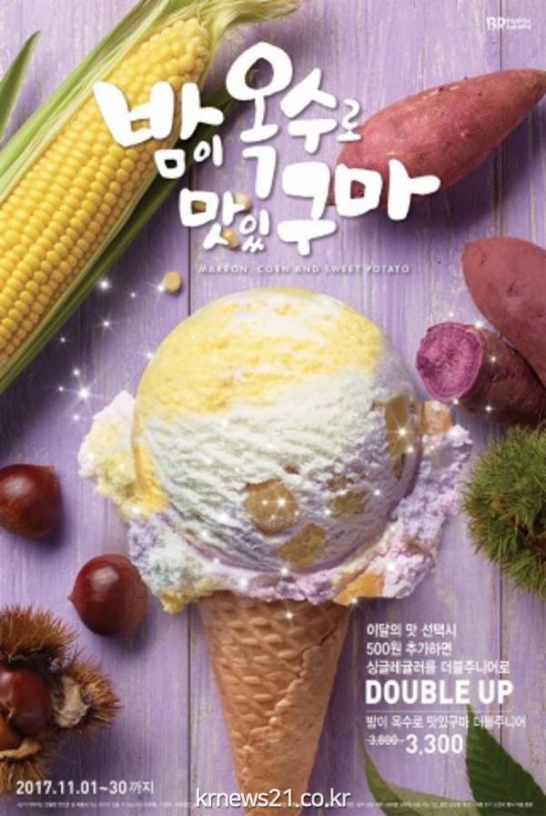 이달의 맛 ‘밤이 옥수로 맛있구마’는 남녀노소 누구나 좋아하는 간식 밤, 옥수수, 자색 고구마를 아이스크림에 활용한 제품으로 세가지 맛 아이스크림에 부드럽게 씹히는 고구마 조각을 넣어 만들었다. 고소하면서 담백한 ‘밤이 옥수로 맛있구마’는 식사 후 온 가족이 함께 둘러앉아 가을의 정취를 즐길 수 있는 디저트다. 가격은 더블주니어 기준 3800원이다.