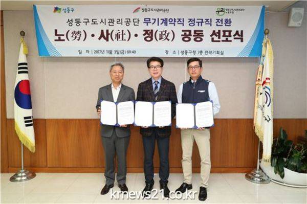 성동구(구청장 정원오)는 지난 3일 구청 7층 전략회의실에서 성동구와 성동구도시관리공단, 성동구도시관리공단노동조합이 무기계약직의 정규직 전환에 대해 노(勞)·사(社)·정(政) 공동 협약을 체결했다.
