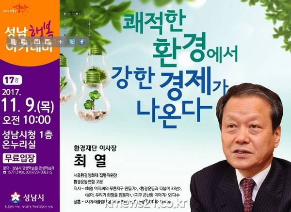 성남시(시장 이재명)는 최열 환경재단 이사장을 초빙해 오는 11월 9일 오전 10시 시청 1층 온누리 홀에서 성남행복 아카데미 제17강을 연다.