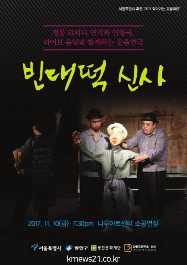 서울 광진구(구청장 김기동)는 주민에게 문화 향유 기회를 주기 위해 오는 10일 자양동 나루아트센터에서 인형극 ‘빈대떡 신사’를 선보인다고 9일 밝혔다.