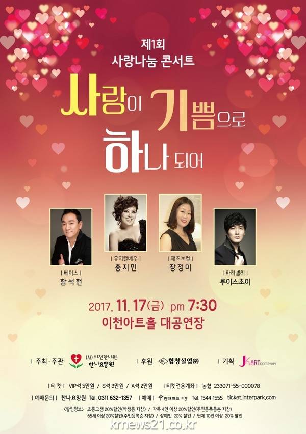 이천시 대월면 소재 한나요양원(원장 한동숙)은 오는 11월17일(금) 저녁7시30분 이천아트홀 대공연장에서 ‘제1회 사랑나눔 콘서트’를 개최한다고 밝혔다.