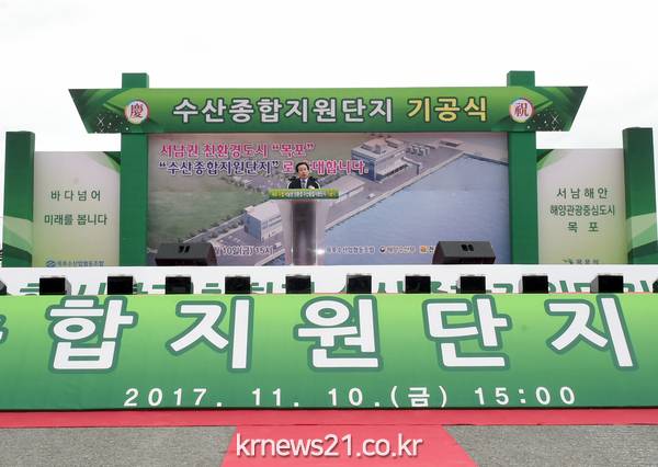 서남권 친환경 수산종합지원단지 조성사업 기공식이 10일 목포시 죽교동 북항 4부두에서 박홍률 목포시장, 박지원 국회의원, 조성오 시의장, 시·도의원 등 800여명이 참석한 가운데 개최됐다.
