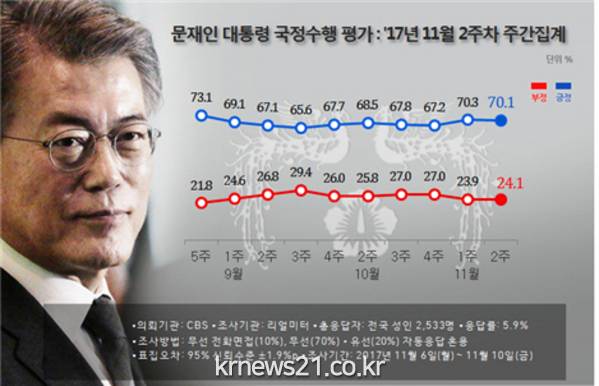 여론조사 전문기관 리얼미터가 CBS 의뢰로 6~10일 전국의 성인 2533명을 대상으로 조사해 13일 발표한 여론에 따르면 문 대통령의 11월 둘째주 국정수행 지지율(긍정평가)는 70.1%로 나타났다.