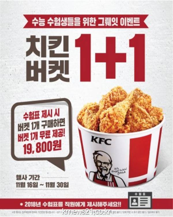 행사 기간에 전국 KFC 매장에서 오리지널 및 핫크리스피 치킨버켓(9조각)을 주문하고 매장 직원에게 수능 수험표를 제시하는 수험생들에게 버켓 1개를 무료로 증정한다.