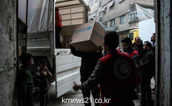 ▲ AFP / Hamza Al-Ajweh[제공자ⓒ 뉴스21통신. 무단전재-재배포 금지.]반군이 장악한 시리아 도우마에서 시리아 적십자사 대원들이 구호 물품을 내리고 있다. 국제적십자위원회(ICRC) 대변인은 2만1500여 명을 위한 비상약과 음식이 담긴 구호품이 3개월 만에 처음으로 인도됐다고 밝혔다.