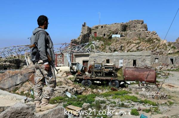 무장한 예멘 남성이 사우디 주도로 이루어진 테즈(Taez) 도시 공습으로 파괴된 통신탑을 바라보고 있다.