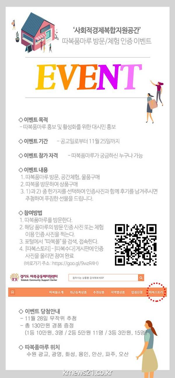 따복 품마루 방문인증 사진 또는 공간체험, 물품구매 인증 사진을 찍어 따복 몰 홈페이지(http://mall.ddabok.or.kr)에 올리면 참여 가능하다. 1등 10만원에서부터 3등 3만원상당의 경품을 총 29명에게 증정할 예정이다.