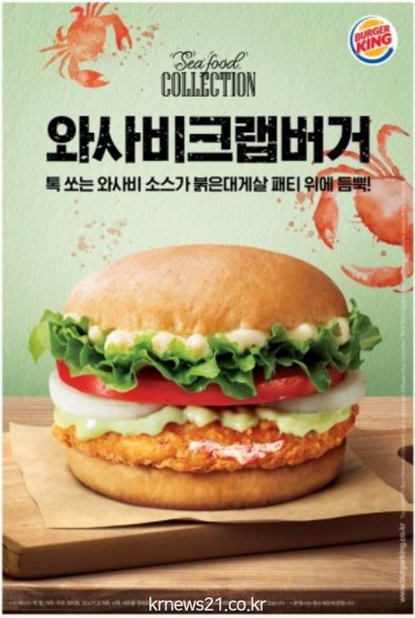 프리미엄 햄버거 브랜드 버거킹이 촉촉한 붉은대게살 패티와 알싸한 와사비 소스가 어우러진 ‘와사비크랩버거’를 출시했다.