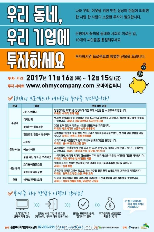 은평 소셜 크라우드 펀딩은 공유경제, 친환경, 사회적 약자배려 등 은평구 내 사회적 문제를 해결할 수 있는 프로젝트를 소개하며 지역주민에 참여를 유도한다. 은평구 주민들은 손쉽게 홈페이지(www.ohmycompany.com)에 접속하여 원하는 프로젝트를 클릭하고 투자액을 결제하면 된다.
