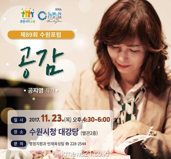 수원시는 23일 오후 4시 30분 수원시청 별관 대강당에서 ‘공감’을 주제로 제89회 수원포럼을 연다. 이번 포럼은 ‘사회적 약자에 대한 따뜻한 시선’으로 대표되는 작가 공지영 씨의 강연으로 진행된다.