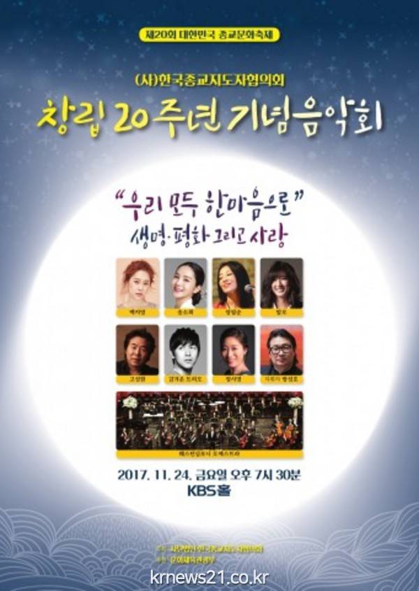 사단법인 한국종교지도자협의회가 24일(금) 오후 5시 30분, 7시 30분 여의도 루나미엘레 컨벤션 홀과 여의도 KBS홀에서 협의회 창립 20주년 기념식 및 음악회를 개최한다.