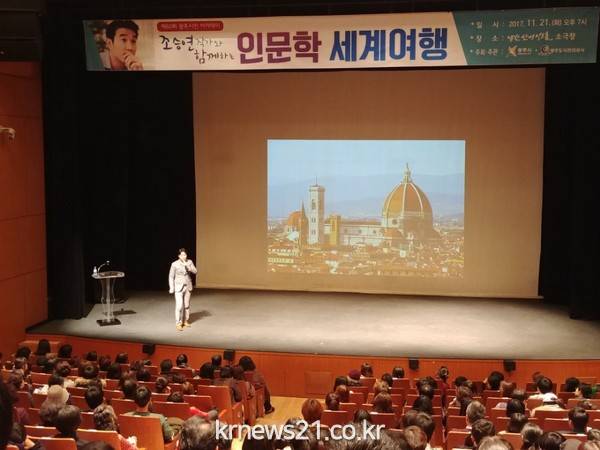 이날 강연에서 조 작가는 100여분 동안 고대부터 중세시대까지 유럽의 건축사조와 나라별 특성을 흥미롭게 풀어냈다. 또한 여행을 더 깊게 즐기기 위한 인문학적 식견의 필요성을 강조해 280여명의 시민들로부터 큰 호응을 받았다.