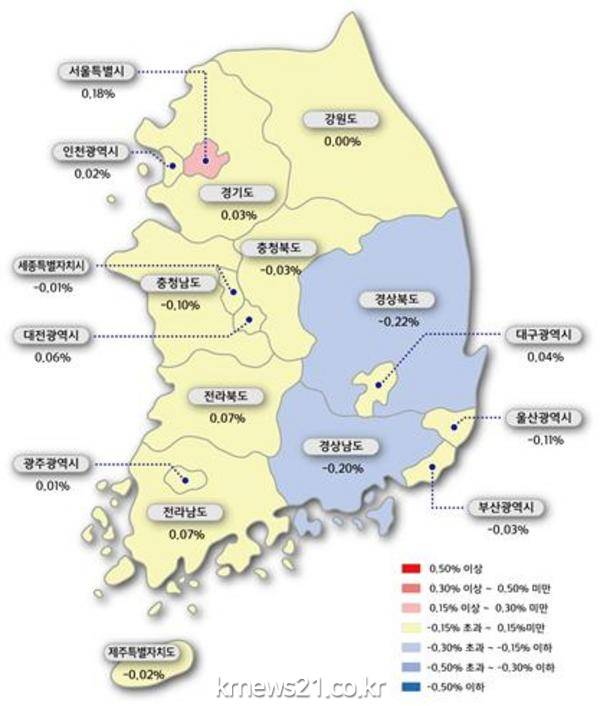 수도권은 0.02% 상승했는데, 서울이 0.07% 올랐고, 경기·인천과 지방은 각각 0.01%, 0.02% 하락했다.