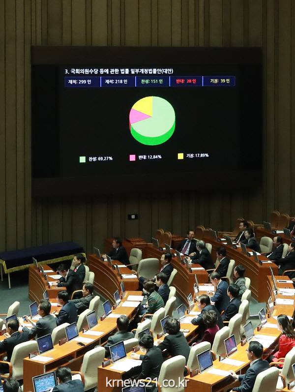 여야가 24일 본회의를 열어 국회의원 보좌진을 현행 7명에서 8명으로 늘리는 ‘국회의원 수당 등에 관한 법률 개정안’을 통과시켰다. 표결 결과는 재석 과반수를 넉넉하게 넘겼다.