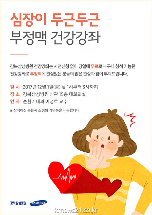 성균관의대 강북삼성병원(병원장 신호철)은 12월1일 오후 1시, 신관 15층 대회의실에서 ‘심장이 두근두근, 부정맥’이라는 주제로 건강강좌를 개최한다.