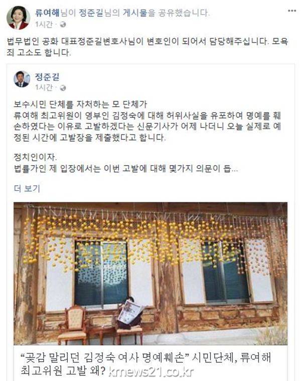 류 최고위원은 28일 페이스북을 통해 “법무법인 공화 대표 정준길 변호사님이 변호인이 되어서 담당해주신다. 모욕죄 고소도 한다”며 정 변호사의 글을 공유했다.