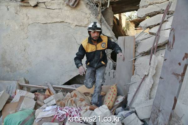 시리아 정부군의 공습이 발생한 다마스쿠스 외각 고우타(Ghouta) 동부 지역에서 '화이트 헬멧'으로 알려진 민병대원이 건물 잔해 속을 수색하고 있다.