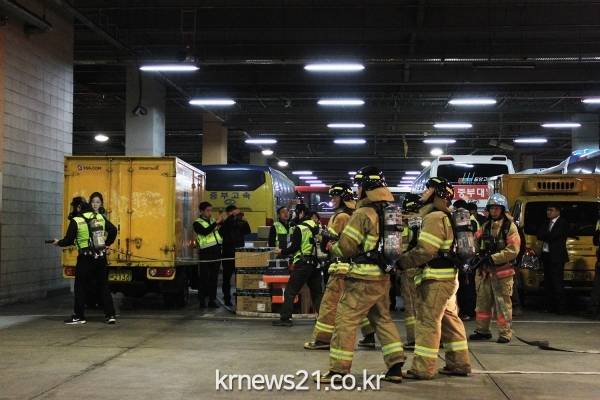 이날 훈련은 복합터미널 서관 지하주차장에서 화재가 발생한 상황을 가정해 터미널 종합상황실에서 신속한 119 화재신고와 화재상황 전파, ‘119 소방차가 진입하기 전까지’의 초동조치 훈련을 했다.