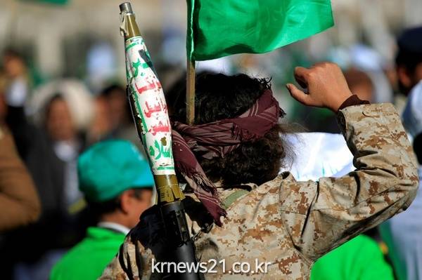 예멘 수도 사나에서 휴대용 로켓포(RPG)로 무장한 시아파 반란군의 모습. 사우디아라비아는 30일(현지시간) 예멘 반군이 공격한 탄도미사일 1기를 격추했다고 밝혔다. 반면 예멘 반군은 미사일이 사우디 내 목표물을 '명중' 시켰다고 주장했다.