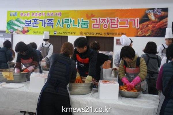 대구지방보훈청은 고령 보훈가족을 위한 맞춤형 노후복지사업의 일환으로 30일 대구과학대와 함께 '보훈가족 사랑나눔 김장 담그기' 행사를 가졌다고 밝혔다.