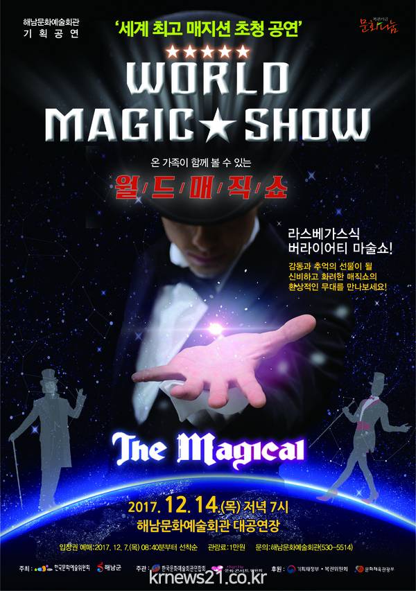 해남군은 오는 12월 14일 해남문화예술회관에서 세계 최고 마술사 10여명이 함께하는 마술공연 월드매직쇼를 개최한다.