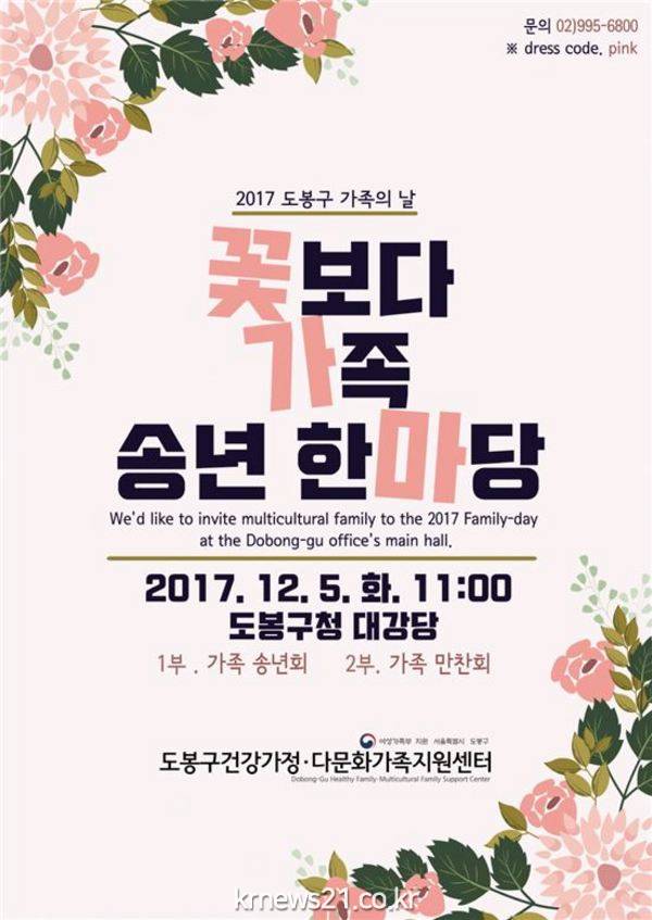 도봉구(구청장 이동진)건강가정·다문화가족지원센터(센터장 박우철)가 올 한해 가족관계 증진을 위해 다양한 프로그램을 이끌고 참여한 가족들을 대상으로 오는 5일 구청 2층 대강당에서 '꽃보다 가족, 송년한마당'을 마련한다..
