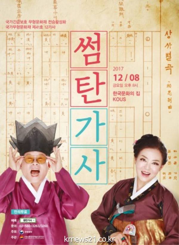문화재청, (재)전통공연예술진흥재단(이사장 손혜리)이 8일 금요일 오후 8시 삼성동 한국문화의 집 KOUS에서 ‘국가긴급보호무형문화재 12가사 지원공연 <썸탄가사>’를 무대에 올린다.