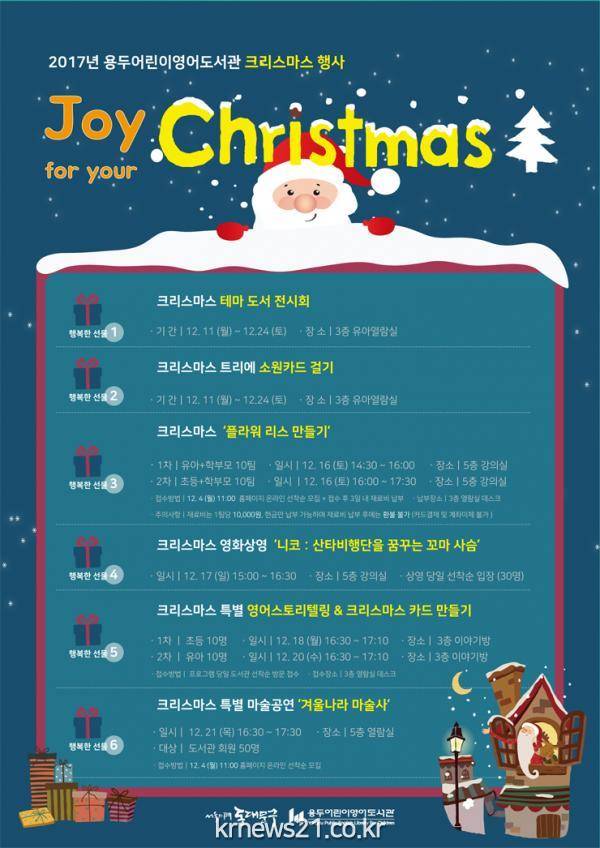 용두어린이영어도서관(관장 이주영)은 ‘Joy for your Christmas day'라는 주제로 오는 11부터 24일까지 크리스마스 독서 문화 체험 프로그램을 풍성하게 준비했다.