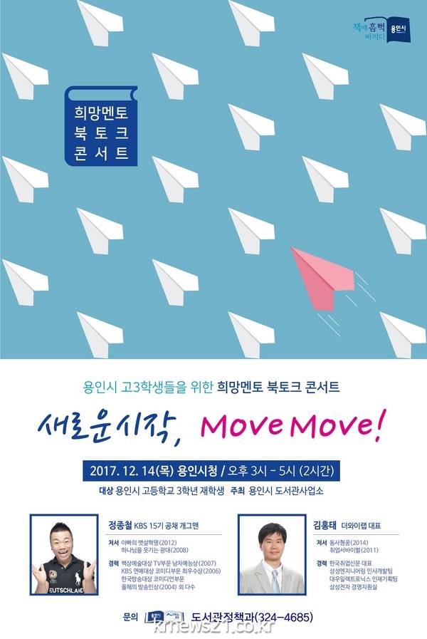 용인시는 오는 14일 오후3시 시청 에이스 홀에서 대학수학능력시험을 마친 고3학생들의 진로설계를 돕는 무료 특강 ‘희망 멘토 북 토크 콘서트’를 개최한다고 밝혔다.